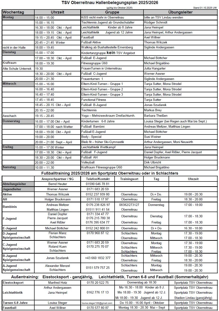 Hallenbelegung FZZ Oberreitnau und Trainingszeiten Sportgruppen